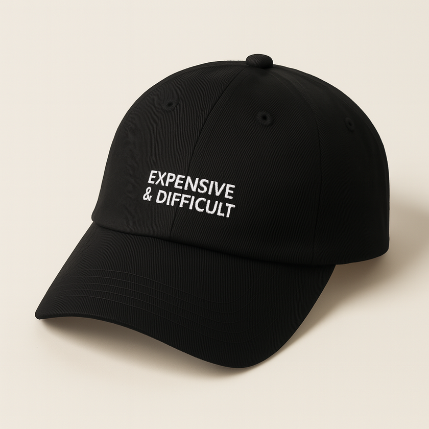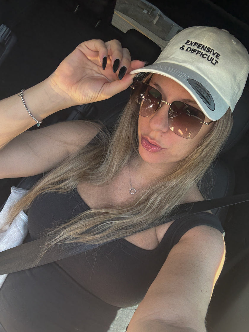 Inspired by the unapologetic elegance of couture fashion, the Expensive & Difficult hat is for women who carry confidence as their signature. This cream-tone cap features sharp black embroidery—a modern emblem of bold femininity.